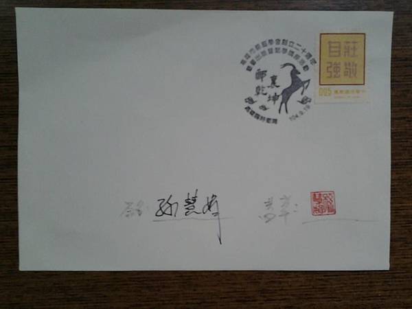 戳名:高雄市郵藝學會創立20週年叢書出版暨郵學講座活動。日期:104.9.19。