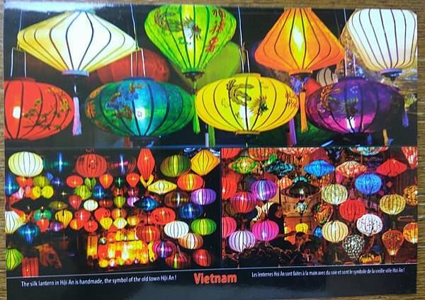 每次出國旅遊,總是會寄幾張明信片回台留下紀念,這個習慣一直都沒改變,2018年從電視上知道越南有一個世界遺產的古城會安,於是安排了會安之旅,會安在越南中部離峴港約40分鐘路程,這一個小鎮沒有高樓,差不多都是一些平房,來到會安古城,你會發現觀光客非常的多,一個小城鎮可以因一個古蹟帶來經濟的效益!會安讓我留下最深的印象就是各種造型的燈,所以我自己特別的買了一張的各種燈造型的明