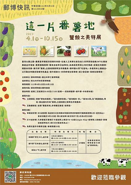 農業是臺灣早期經濟發展的命脈,在邁入工商業社會及加入世界貿易組織(WTO)開放農產品市場後,農業面臨衝擊,糧食自給率日益降低。為串起民眾與土地的情感,認識在地農業,中華郵政公司與國立科學工藝博物館合作,訂於112年4月1日至10月15日在郵政博物館6樓特展室舉辦「這一片番薯地-豐饒之美特展」,展示與「農業」主題相關郵票及早期農具,期呼籲大眾「吃當地」,多選用本土農產品,以行動支持農民發展特色產品,提升經營力,共同疼惜生態環境,減少碳足跡,落實友善環境。