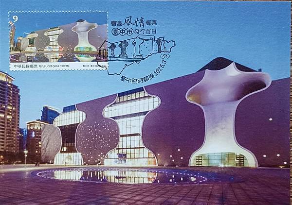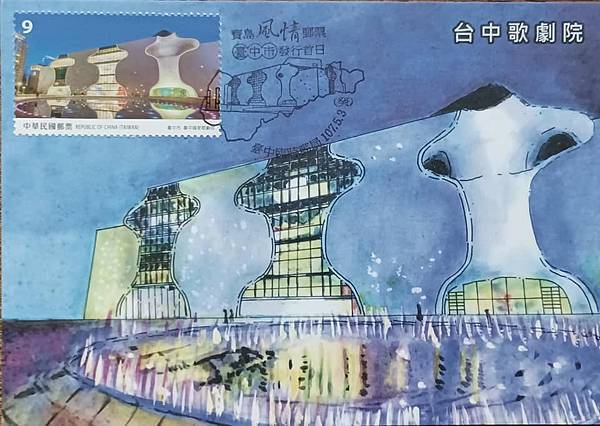 民國107年5月3日,「寶島風情」系列郵票,來到了臺中市,而此組郵票中,就發行有臺中國家歌劇院郵票,而本人製作了五枚,現介紹如下: