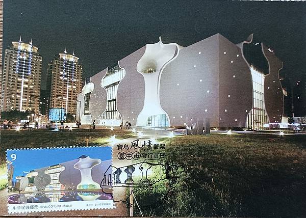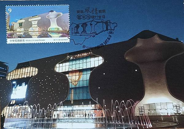 Muska攝影版一枚,此枚是由側面遠距離拍攝,拍攝時間點也是在夜晚,從片中一樣可以感受到,台中國家歌劇院在夜晚中,燈光的點綴之下,展現出另一種的氣勢!原圖卡銷蓋民國107年5月3日,寶島風情郵票,首日台中臨局戳。(圖2)