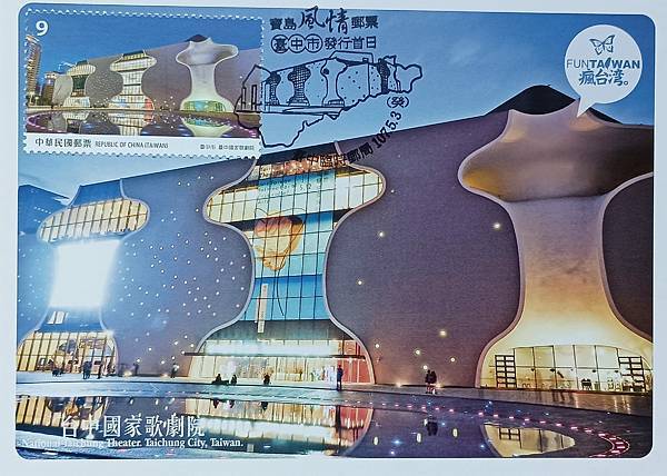 瘋台灣版一枚,此枚是近距離的角度拍攝,拍攝時間點是夜晚,從近距離的角度來看,可以感受到台中國家歌劇院的五彩的美感,也可以感覺到它的雄偉。原圖卡銷蓋民國107年5月3日,寶島風情郵票,首日台中臨局戳。(圖3)