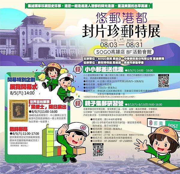 SOGO百貨高雄店和高雄郵局主辦郵政博物館和高雄市郵藝學會協辦的「悠郵港都~封片珍郵特展」將於8月3日-831,在三多商圈的SOGO百貨8樓展出,8月5日(六)11點開始有臨時郵局,贈送局贈封,當日並特別展出世界第一枚郵票—英國黒便士郵票(1840年發行),8月5日14:00舉行開幕典禮。