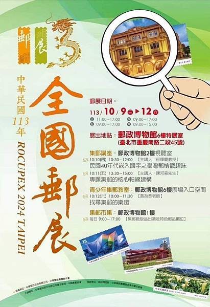 113年全國郵展,將在今年10月9-12日,在台北市郵政博物館舉辦,預計展出250框,歡迎ㄍㄜˋ