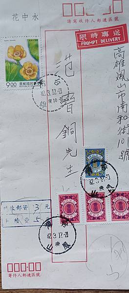 民國82年3月12日,高雄寄本市鳳山限時專送封,當時限時專送郵資為12元,而封上只貼9元,短少3元,除需補足3元郵資外,需再加上手續費5元,共需補足8元郵資