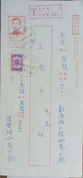 民國77年4月1日,南投市寄本市封,當時平信郵資為3元,封上郵資為2元,短少1元,除需補足1元外,需加上手續費4.5元,合計應補5.5