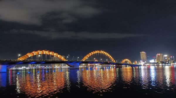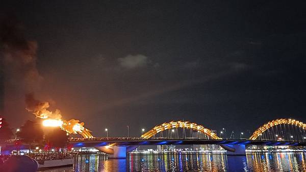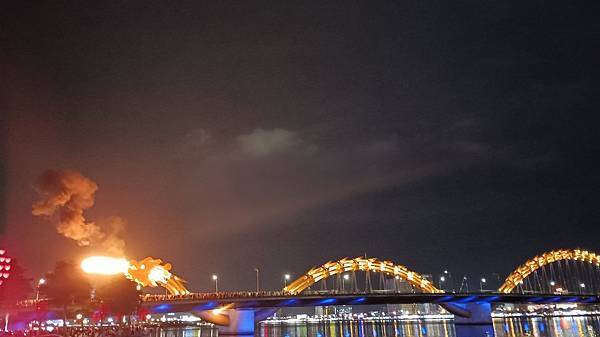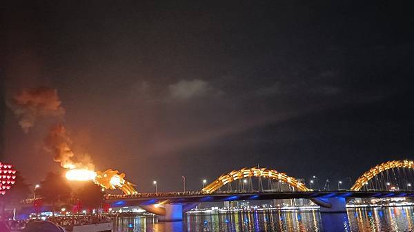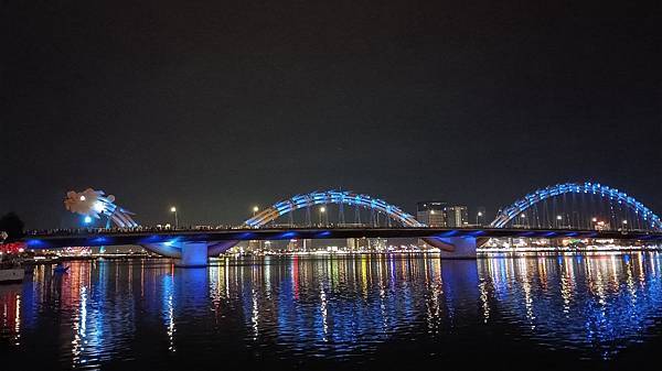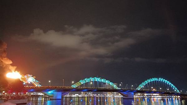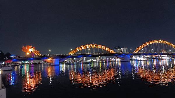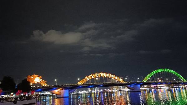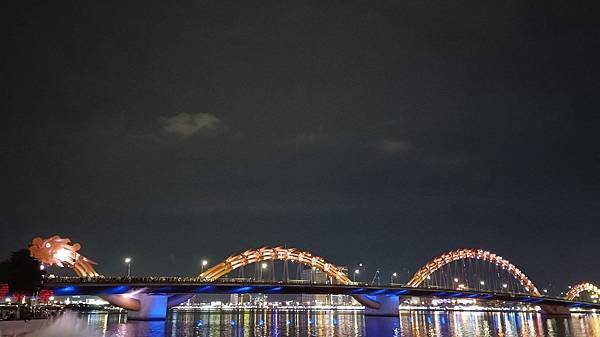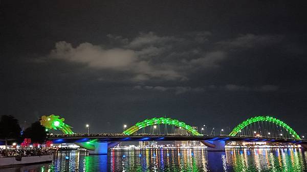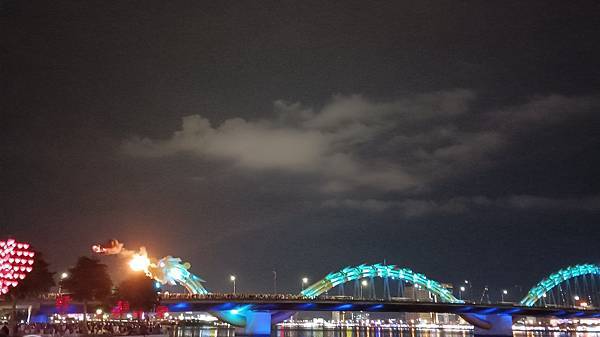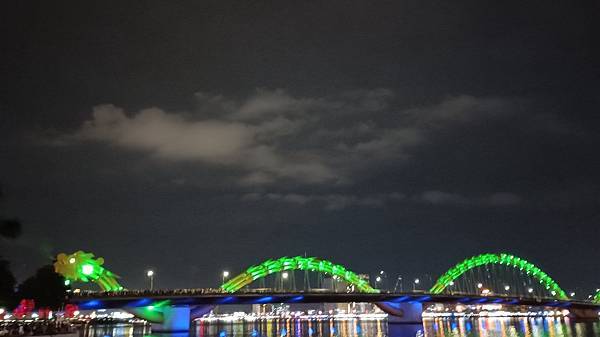 如果要說在峴港的地標,相信去過旅遊的人都會說是漢江上的龍橋,這座橋在平時夜晚時,橋身會定時的變成顏色,一直到晚上十點,到了星期六及星期日龍頭會在九點噴火,也就是在這兩天,龍橋附近會擠滿觀光客來拍照!對於七年前來過這裡時,只有在橋附近有座噴水的龍造型塑像及心型燈座橋外,旁邊全是空曠的,轉眼七年後,這裡ㄓㄣ