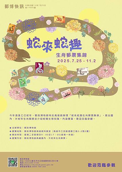 今年適逢乙巳蛇年,郵政博物館特於高雄館辦理「蛇來蛇趣生肖郵票集錦」,展出國內、外蛇年生肖郵票並介紹蛇類生態知識,內涵豐富,歡迎蒞臨參觀。