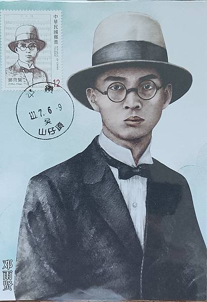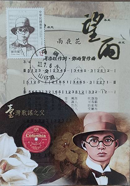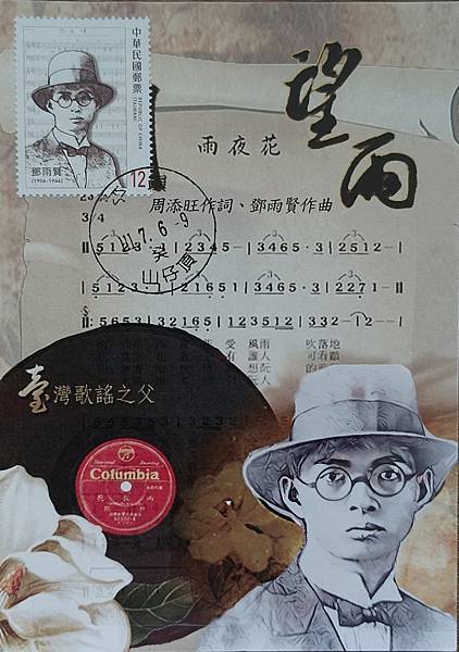 民國111年7月6日,發行的台灣作曲家郵票中,身為「台灣歌謠之父」的鄧雨賢先生, 毫無疑問的入選,郵票中的鄧雨賢先生穿著時髦(當時古倫美亞任職期間收入優渥,留下不少穿著名牌、設計感十足的精美照片),郵票的背景是他創作的閒花嘆歌譜(描寫丈夫因謀生至外地工作,致夫妻分散兩地的思念之情)。而在集郵報導中的介紹:鄧雨賢先生,一生創作近百首膾炙人口的作品,致力於採集民間歌謠融入創作,被譽為「台灣歌謠之父」,代表作有「閒花嘆」、「四季紅」、「月夜愁」、「望春風」、「雨夜花」等,大家都聽過的歌曲。