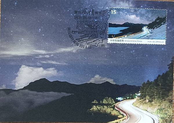 優企版一枚,此枚是由吳初心先生拍攝,片圖是以遠距離的拍攝整個夜空,我們可以感受到,群山在星空之下,少了其它的人為燈光,依照可以很清楚的看到在大城市,無法看到的滿天星星,相信拍攝者拿起相機拍攝時,肯定會不停的按下快門!原圖卡銷蓋民國109年8月12日,首日南投臨局戳。(圖2)