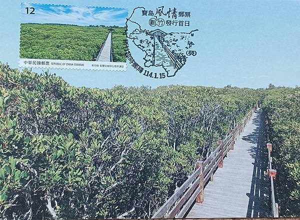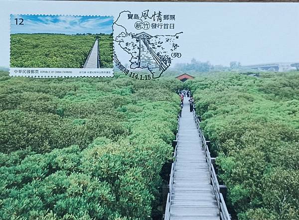 民國114年1月15日,發行的寶島風情郵票-新竹中,新豐紅樹林生態保護區是四枚郵票中,最漂亮的一枚,從集郵報導的介紹中知道,此紅樹林保護區,面積有8.5公頃,是北臺灣地區唯一水筆仔、海茄苳混生的紅樹林,區內設有觀賞步道,為國寶級生態教室,可近距離欣賞濕地特有多元景觀。票圖是以步道由近而遠的延伸,在整片的紅樹林,看到了這枚郵票,讓人就想親臨現場,漫步在其中,一面欣賞的風景及植物,真的會讓人心情愉悅!此次個人製作了五枚原圖卡,現介紹如下: