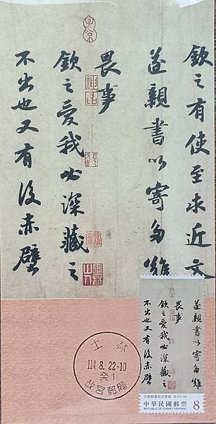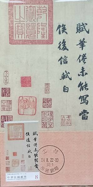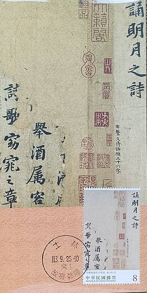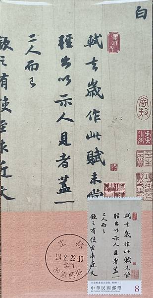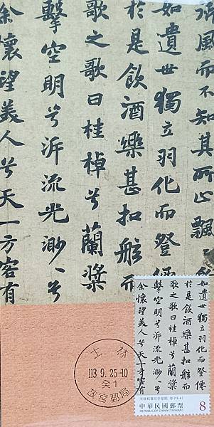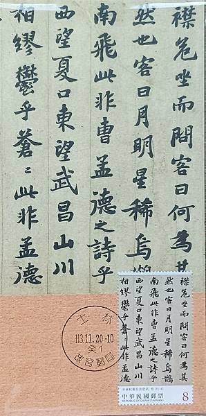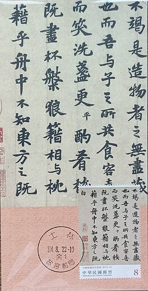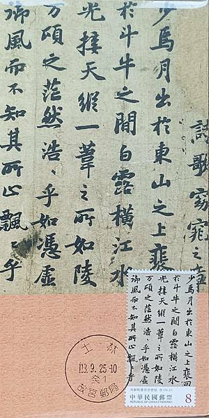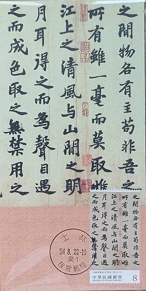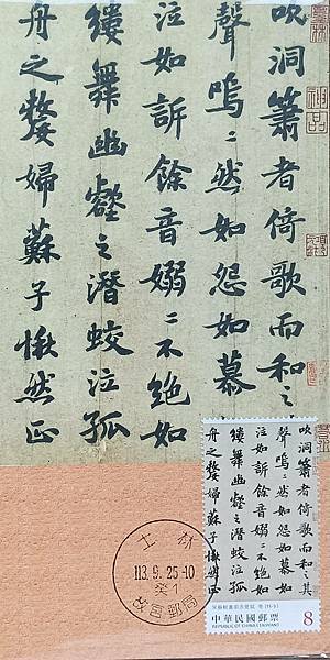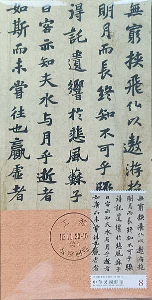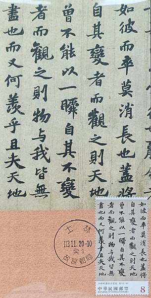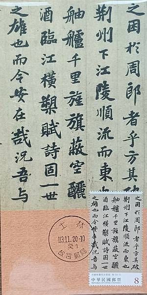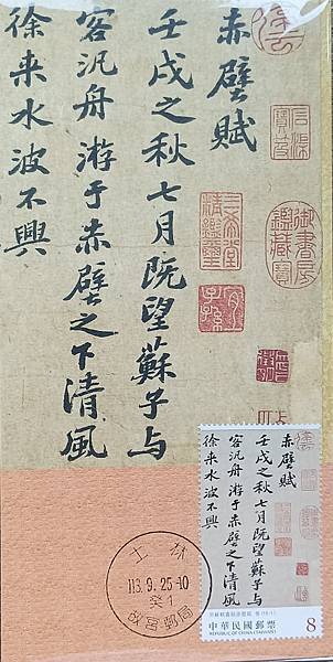 中華郵政公司為闡揚書法之美,以國立故宮博物院典藏宋蘇軾「書前赤壁賦」卷為主題,分次發行系列郵票3套,發行日期分別為民國113年9月25日、民國113年11月20日及民國114年8月22日,郵票1套5枚,以聯刷方式印製,郵票面值均為8元。票中的前赤壁賦,展現蘇軾選用行楷表現出一種靜穆而深遠的氣息,結字矮扁而緊密,筆墨豐潤沉厚,可以說是蘇軾少見的用意之作。我們從郵票之中,就可以感受到,而從原圖卡中,更能展現出前赤壁賦全文中的氣勢!蘇軾前赤壁賦郵票,我製作了好幾組不同版別的原圖卡,其中我最喜歡的是舊城文創版,此版的尺寸是屬於長方形的型式,更能表現出此賦的美感!原圖卡分別是銷蓋民國113年9月25日、民國113年11月20日及民國114年8月22日,首日士林故宮郵局戳,共有15枚。(圖1-圖15)
